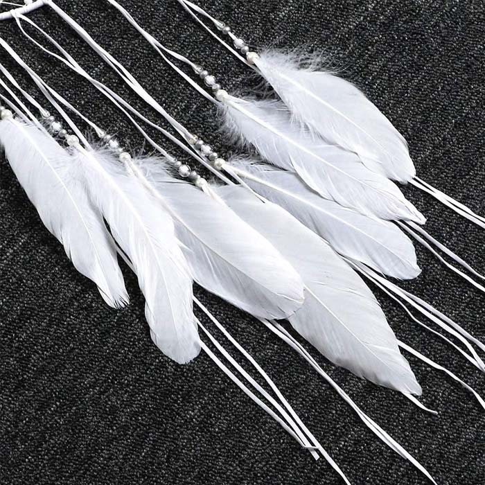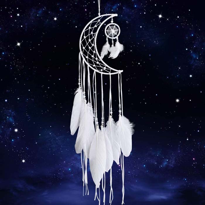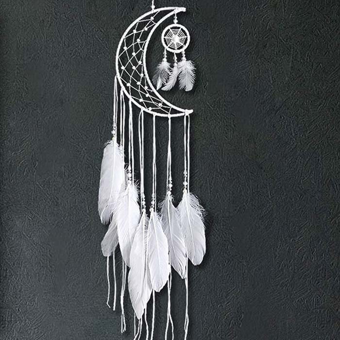 Dieser Traumfänger ist etwas ganz Besonderes. Mit seinem einzigartigen Halbmond-Design ist er eine tolle Dekoration für Ihr Zuhause. Die weissen Perlen und die hochwertige weissen Feder verleihen dem Traumfänger einen eleganten Look. Der Traumfänger ist auch eine tolle Hochzeit, Party- oder DIY-Wanddekoration.